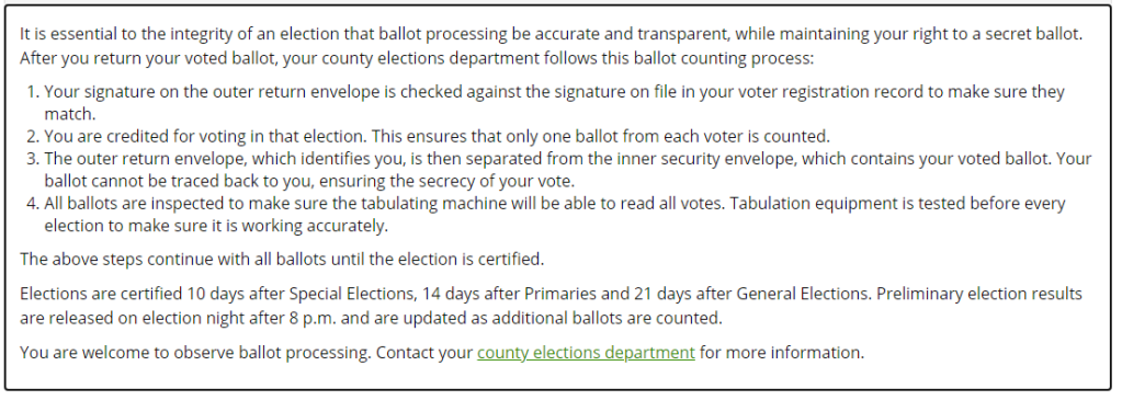 Another issue is that even if signatures are verified, the ballots are not signed. The envelopes they came in are signed but once the ballots have been removed from their envelops, the ballots could easily be replaced by bad actors. It’s very true that it is who counts the votes that matters.